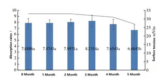 Prepare a standard synthetic test solution and put it aside for 24 hours. It’s density is 1.05 ± 0.05 g/cm3, viscosity 11.9 ± 0.7s and surface tension (36 ± 4) mN/m. Store it in a cool place away from sunlight for several months and verify its related indicators. The results showed that the density and viscosity did not change, only the surface tension changed. See the Figure 1. Use this standard synthetic test solution to test the absorption speed of sanitary napkins in the same batch. The results showed that there was no significant difference in the absorption rate of the standard synthetic test solution in the first 4 months, but the standard deviation was only low in January and February. The surface tension value remained unchanged for the first 2 months, but at the third month it started to decrease and fall below the standard requirement (27mN/m) in the fifth month.