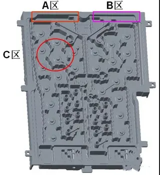 The area A on the left is the space between the inner cavity structure and wall of the water tail analyzed from the product structure (see Figure 4). When the molten aluminum is filled to this position, it meets the mold wall and forms a wrap, which affects the filling and exhaust of the molten aluminum. When the exhaust is not smooth, high pressure will occur, which will cause difficulty in melt filling and insufficient injection volume, resulting in the defects such as loose structure and exposed gas holes in the C zone of the casting. There are no defects for the transition position between the A zone and C zone, because it is relatively close to the tail and the overflow system can discharge part of the gas. The structure of the zone B on the right is connected to the wall of the water tail, which can be filled and exhausted smoothly, so there is no gas hole in the production. In addition, the die-cast engineer at the trial-production site conducts trial-production under good process conditions, and the situation of gas holes caused by the die casting process doesn't exist, such as excessive gas content in the aluminum liquid, excessive spraying, and unreasonable injection process parameters.