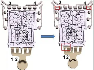 From the MAGMA simulation, the filling speed of gate 1 is too fast, and that of the gate 2 is too slow, causing the leftmost aluminum to quickly seal the slag bag at the tail, resulting in poor exhaust and forming an air entrainment area. In addition, the filling of the left half of the product is slower than that of the right half. The improvement plan we proposed was to reduce the filling speed of gate 1 by half sealing, and to increase the width of the gate 2 by 5 mm to the left to speed up the filling speed, so that the filling of the left and right sides of the product tended to be balanced. In addition, in order to improve the exhaust, the exhaust channel was provided for the slag bags 3 and 4, so that the gas on the left and right corners of the product was directly discharged to the exhaust plate of the mold (See Figure 6).