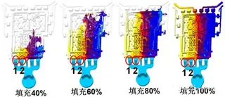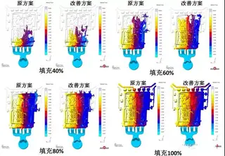 Use MAGMA simulation software to simulate the die-cast scheme. Figure 5 shows the different filling volumes: 40%, 60%, 80% and 100%, it is found that the filling of the left half of the product is slower than that of the right half; and the filling speed of the gate 1 is slower than that of the gate 2. An entrained gas area appears in the upper left corner of the product.