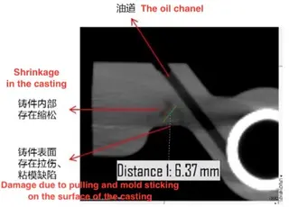 Technicians use various tools to confirm the cause of the leakage, and simple visual inspection and professional water testing equipment are adopted to confirm the leak point. Perform CT inspection or color development flaw detection on the parts to confirm the leakage channel, and slice for metallography analysis finally. At present, the main reason for leakages is that there is shrinkage porosity inside the casting, and the size of the shrinkage porosity varies from tens of μm to several mm. At the same time, there are damage and mold sticking on the surface of the casting. The combination of the two forms a channel that expands further when the oil or coolant temperature is high, resulting in leakages of oil or coolant. (Figure 1)