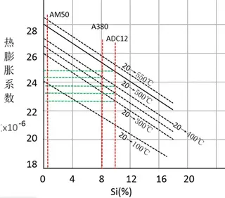 The thermal expansion coefficient of die-cast aluminum alloy and magnesium alloy is mainly related to the Si content. The higher the Si content is at the same temperature, the smaller the thermal expansion coefficient will become. Figure 2 shows the thermal expansion coefficients of three commonly used die casting materials, that is ADC12, A380, and AM50. The vertical line is the median value of the material composition requirements. Die casting manufacturers can know the thermal expansion coefficient according to their company's common Si content.