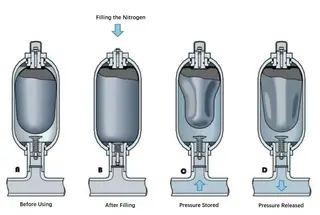 Nitrogen is commonly used due to its stability, lack of oxidation or reduction properties, and its positive impact on maintaining hydraulic oil performance without causing denaturation. Pre-charging nitrogen in the accumulator's airbag, separated from hydraulic oil, ensures pressure equalization during oil filling. As hydraulic oil enters, the compressed nitrogen airbag increases pressure until the set pressure is reached.