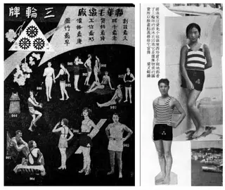 Although there is always the latest information from various countries, the popularity of new swimsuits in China during the Republic of China generally lagged for 2 to 3 years. For example, in 1927, the Picture Times introduced the new American women's swimsuit, which was a striped top and decorated with a belt, but the style didn't become popular in China until 1930. Another example was the split swimsuit, which became popular in the United States in 1930. In 1932, the 835th issue of "Picture Times" published a photo titled "The latest American swimsuit with only the cloth covering the breast", like a middle-aged woman wearing a split swimsuit, and the top was similar to bras, with thin straps and a low V-neck. However, similar styles became popular in China until 1935. As for the material of swimsuits, although there have been new materials since the mid-1930s, knitted wool was still the most important material in China during the Republic of China. "Diyang" was a famous wool brand at that time.