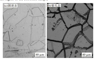 Figure 2 Intercrystalline corrosion of the sample in the uncorroded area in the solid solution state and the sensitized state