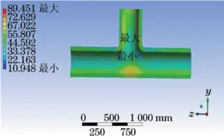 The finite element simulation calculation results of the tee are shown in Figure 7. It can be seen from Figure 7 that under the comprehensive conditions of the model, the maximum stress area is located at the area where the tee and the upper weld are connected; the maximum stress value is 89.4MPa, and the maximum stress area is consistent with the crack position.