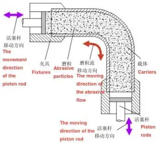 The working principle of abrasive flow grinding and polishing the inner surface of the bend is shown in Figure 2. Abrasive particles of different shapes are randomly mixed in the grinding and polishing liquid as a tool to form a solid-liquid two-phase abrasive particle flow and fill the inside of the bend. The tool clamps the bend end, and the piston rod reciprocates to exert pressure on the bend. The abrasive particles repeatedly rub against the inner wall of the bend to remove the debris. This method requires high pressure when grinding the inner surface of the bend. If the pressure is too great, the impact on the bending part will be more serious, and even cracks will occur. If the pressure is too low, there will be no obvious effect of grinding and polishing. Abrasive flow polishing has high requirements on fixtures, and it is difficult to unify fixtures for bends of different sizes.