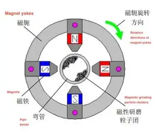 The inside of the bend is filled with magnetic abrasive particles, and the outer magnet yoke of the bend is surrounded by magnets. The bend is fixed and the magnet yoke drives the magnet to rotate around the bend according to the direction of rotation. The internal magnetic abrasive particles rotate with the external magnet, and continuously rub the inner wall of the bend to remove the debris. The magnet yoke rotates and reciprocates along the axis of the bend and complete the grinding of the inner surface of the bend. Magnetic particle grinding can effectively solve the problem of uneven quality of the inner surface of the bend and improve the service life of the bend.