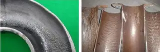 It can be found that the elbow is the most common part with the greatest bearing force, partial thinning and perforation in the entire pipeline by analyzing most failure cases. Relevant studies have pointed out that the wear caused by scouring of the elbow is 50 times higher than that of the straight pipe, as shown in Figure 1.1. Both elbows and straight pipes have obvious wear caused by scouring. It can be found that the wear caused by scouring of the elbow is more serious than that of the straight pipe, and wear of outer walls of the elbow is significantly serious than its inner walls by comparing the two figures.