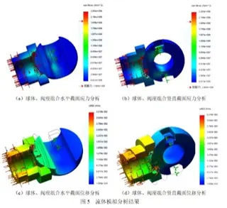 The results of the fluid simulation analysis are shown in Figure 5. The stress is concentrated at the position of the shaft hole on the sphere, and the maximum stress exceeds the yield strength; the spherical stress is small, resulting in elastic deformation, and the deformation is uneven. The stress on the seat does not exceed the yield strength, and elastic deformation also occurs. The deformation of the horizontal position of the sealing surface is 0.02218 to 0.02284mm, and the deformation of the upper and lower positions is 0.01991 to 0.02408mm; the elastic deformation of the valve seat can compensate for the elastic deformation of the sphere to achieve sealing.