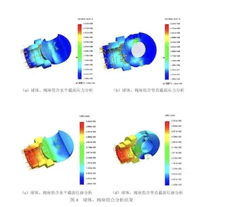 The analysis results of the combination of the ball and the valve seat are shown in Figure 4. It can be seen from the figure that the stress is concentrated at the position of the shaft hole on the sphere, and the maximum stress exceeds the yield strength; the spherical stress is small, resulting in elastic deformation, and the deformation is uneven. The deformation of the horizontal ball mouth position is 0.02116 to 0.02151mm, and the deformation of the upper and lower positions is 0.01155 to 0.01639mm. The stress on the valve seat does not exceed the yield strength, and elastic deformation also occurs; the deformation of the horizontal position of the sealing surface is 0.03571 to 0.03635mm. The deformation of the upper and lower positions is 0.02973 to 0.04044mm; the elastic deformation of the valve seat can compensate for the elastic deformation of the sphere to achieve sealing.