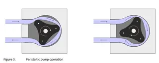 A peristaltic pump delivers fluid by mechanically squeezing a space enclosed by a flexible element. A common type operates by means of rollers acting directly on a hose containing the liquid (Figure 3). Peristaltic pumps are used extensively as metering pumps in laboratory and medical applications but advances in materials technology have led to heavy duty pumps capable of dealing with highly viscous fluids, sludges and slurries in a wide range of industrial applications.