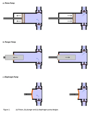 With a piston pump, a defined volume of liquid is drawn into the pump on the suction stroke and delivered on the compression stroke (Figure 1a). With a plunger design, the volume of fluid moved by the pump depends on the plunger size (Figure 1b). In both cases, the volume of liquid delivered is known precisely. However, the reciprocating action means that no fluid is delivered during the suction stroke of the pumping cycle. This creates pulses in the discharge with the fluid accelerating during the delivery phase and slowing during the suction phase. Pulsation can cause damaging vibrations in the discharge system and often some form of damping or smoothing is employed. Pulsing can also be minimized by using additional, out of phase, pistons or plungers. The efficiency of the seal around the piston or plunger is important in maintaining the pumping action and to avoid leaks.