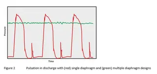 Diaphragm pumps have the advantage of being hermetically sealed making them ideal for pumping hazardous fluids. However, the accuracy of delivery is dependent on the performance of the discharge and suction side valves and the extent of any backflow. Diaphragm pumps also suffer from pulsation in the discharge although this is reduced by having two (or more) diaphragms with one in its compression phase whilst the other is in suction (see Figure 2). A design using this approach is the