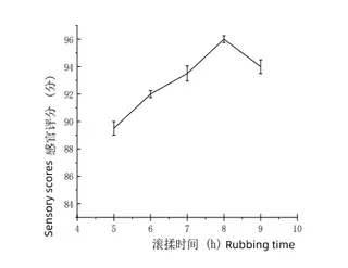 According to the figure, the sensory evaluation score increased first and then decreased with the increase in rubbing time (P being less than 0.05), and the highest score was 96 at the 8th hour of rubbing. When the rubbing time is short, the muscle tissue is hard, and the shear force, hardness and chewiness are good. When the rubbing time is long, the muscle tissue is loose, which may easily lead to poor appearance, uneven shapes, and heavy taste. After comprehensive consideration, the rubbing time between 7 and 9 hours is more suitable, which can better improve the texture and other characteristics of the sauced beef.