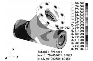 The valve body is forging with a round hole, and each connection has transition fillets and chamfers. Its structure is relatively complicated. In order to facilitate the calculation, the three-dimensional model of the valve body is appropriately simplified. Create meshes in the model in the MSC. Patran software, load the displacement and pressure constraints according to the boundary conditions; enter the Poisson's ratio and the elastic modulus of the valve body, and then use the Nastran solver for the linear solution. A stress cloud diagram of a 10" GYPF25BY valve body can be obtained, as shown in picture 2.