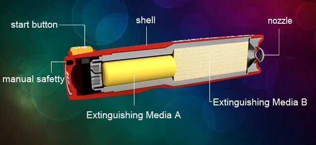 Aerosol fire extinguisher is with certain chemical and physical methods to extinguishing chemicals inside the fire in the form of aerosol spray. Fire extinguishing aerosol fire extinguishing device is the principle of solid solid filled fire extinguishing agent in the interaction of particles in potassium type gas generant decomposition under a large number of efficient fire extinguishing material.