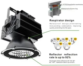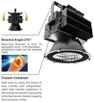 This series of Super Power LED Floodlight adopts modular design with compact structure. The unique HDT high power cooling technology with Fin style heat sinking structure ensures low temperature during operation. The 92% high reflective optical reflector made of pure aluminum gives out uniform light without feeling of glaring. The secondary light distribution beam angle can be served as high bay and floodlight. The pure copper heat pipe makes sure good thermal conductivity while the breather on the fixture can avoid moisture. The surface with high grade electrofusion treatment can prevent salt fog and therefore the fixture can be used in damp environment.