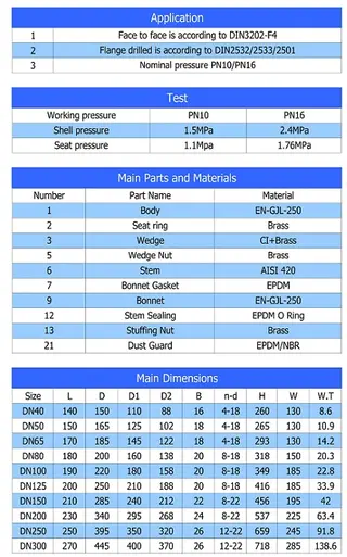 Gate Valve, Seat Ring: Brass, Face to Face DIN3202 F4, Flange drilled according to DIN 2532 / DIN 2533 / DIN 2501, Normal Pressure: PN10/PN16, Size: DN40-DN300